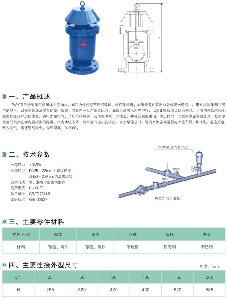 KP快速排氣閥一般壓力PN10-40/1.0-6.4MPa,150Lb-300Lb/2.0-5.0MPa,口徑為DN25-350mm,適用介質為清水,適用于城建,自來水廠,供暖系統,水利,等管路上,一般都是采用法蘭連接方式,適用于工業介質為水的管路上,作為瑞奇排氣閥排除管道內氣體的設備,以提高輸送水設備的效率和保護管道不致變形破裂,是管道的必備之設備。閥為圓桶狀式閥體,共內部主要有不銹鋼浮球及塞頭。 本閥裝設于泵埔出口處或送配水管線中,用以大量排除管道中的集結之空氣,以增進水管及抽水機使用效率,且與管內一旦出現負壓時,此閥能迅速吸入空氣,以保管線因負壓所產生損壞。 KP排氣閥工作原理: KP快速排氣閥利用了水對浮球的慣性自動開啟/關閉排氣口。說得具體一些就是:利用水對不銹鋼浮球的浮力的向上作用特性原理,當水位在閥內上升,在排氣的同時,浮球受到水的浮力作用,不銹鋼球自動上浮,直到浮止與排氣口的密封面接,水泵給壓到一定壓力時球會自動關閉,當閥內水位降低時,不銹鋼球會隨水位下降而下降,這時就會通過排氣口向管道注入大量空氣,裝在管道上后,當管道在運轉時,浮球停在球碗底部,進行大量排氣,當管內空氣排完,水沖進閥內,經過球碗然后反應浮球,使浮球浮動關閉,管道在正常運轉時,如有少量氣體會集中到閥內到相當程度,閥內水位下降,浮球隨之下降,氣體從小孔排出。如水泵停止,隨時會產生負壓力,浮球隨時下降,進行大量吸氣確保管路安全。 適用范圍 瑞奇KP快速排氣閥應用于獨立采暖系統、集中供熱系統、采暖鍋 爐、中央空調、地板采暖及太陽能采暖,城市給水系統等管道排氣。因為水中通常都溶有一定的空氣,而且空氣的溶解度隨著溫度的升高而減少,這樣水在循環的過程中氣體逐漸從水中分離出來,并逐漸聚在一起形成大的氣泡甚至氣柱,因為有水的補充,所以經常有氣體產生。為此就延生出排氣閥這一名詞,在日常生活也解決了不少問題。