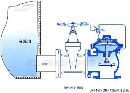 快開液動(dòng)氣動(dòng)排泥閥JM744X/JM644X,是一種由液壓源或氣動(dòng)泊作執(zhí)行機(jī)構(gòu)的角型截?cái)囝愰y門。通常成排安裝在常常池底部外側(cè)壁,用以排除池底常常的泥砂和污物。該閥由尼龍強(qiáng)化橡膠隔膜將閥門分為兩啊腔室,接通液壓或氣動(dòng)源,采用電動(dòng)或手動(dòng)二位四通換向閥控制,實(shí)現(xiàn)快速排泥。該閥將隔膜代替活塞,無運(yùn)動(dòng)摩擦,更適用于泥漿等顆粒介質(zhì),大大提高了閥門的使用壽命。