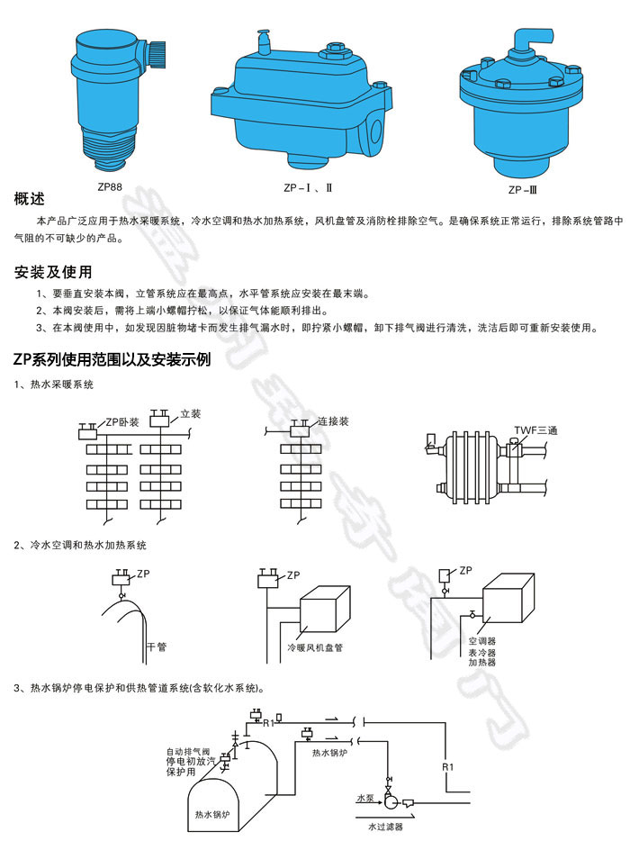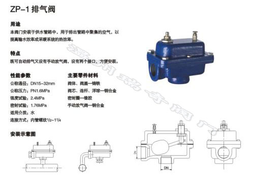 ZP-I、II方形臥式自動(dòng)排氣閥廣泛應(yīng)用于熱水采暖系統(tǒng),冷水空調(diào)和熱水加熱系統(tǒng),風(fēng)機(jī)盤管及消防栓排除空氣。是確保系統(tǒng)正常運(yùn)行,排除系統(tǒng)管路中氣阻的不可缺少的產(chǎn)品。